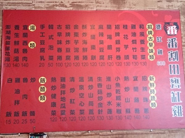 番割田甕缸雞菜單,甕缸雞600元,其餘菜色都在120-140元之間,經濟實惠