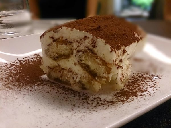 吃完主餐後已經飽到不行,但入寶山豈能空手回,甜點是一定要的。眾人研究了菜單,決定點一份提拉米蘇share就好,Giorgio卻走過來說:「你們一定要點起司蛋糕。來我的店怎麼能不點起司蛋糕呢? 點一份吃吃看,你們一定會說”媽媽咪呀”。沒有,這頓晚餐就算我的。」