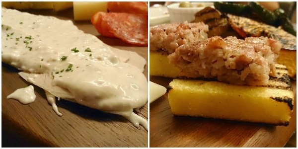 左邊是松板豬左鮪魚酸豆醬,豬肉上撲滿鮪魚泥,酸豆味道並不明顯。右邊是玉米糕和肉醬,都是平常沒吃過的菜色,老闆Giorgio說這些都是他們的家常菜呢。