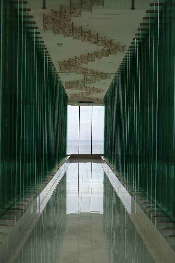通往泳池和UFO Lounge的玻璃走廊是飯店內的熱門景點。可惜當天是陰天,若有陽光灑進來應該很美。