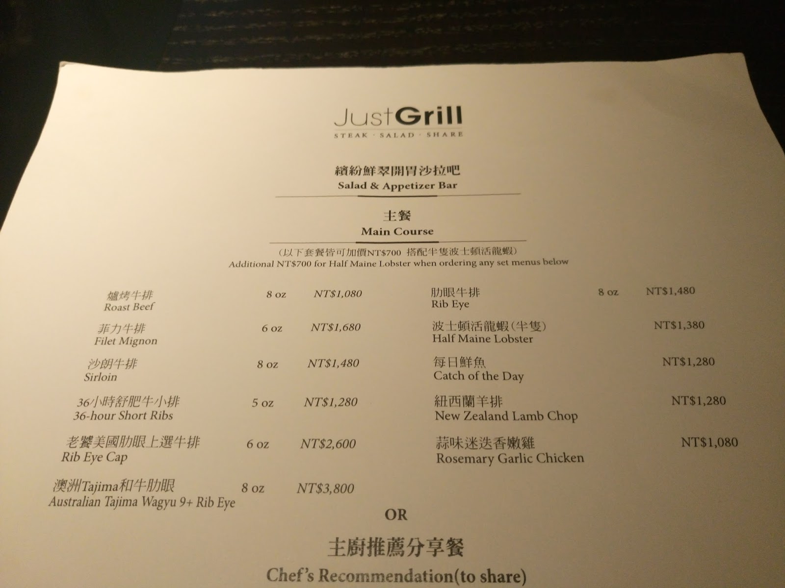 整體心得: Just Grill 就是四平八穩,中等價位ㄍ一ㄥ到該價位最高品質的牛排館,服務也很好。若比沙拉吧的豐富度,當然比不上我的心頭好美福牛排。(其實二訪當天本打算去美福的,但前陣子的槍擊事件…)。論價位和交通方便性當然是Just Grill領先,但是說到牛排,我的一票還是投給美福的熟成牛排啦! BTW,Just Grill 持誠品卡有9折,等於免服務費。