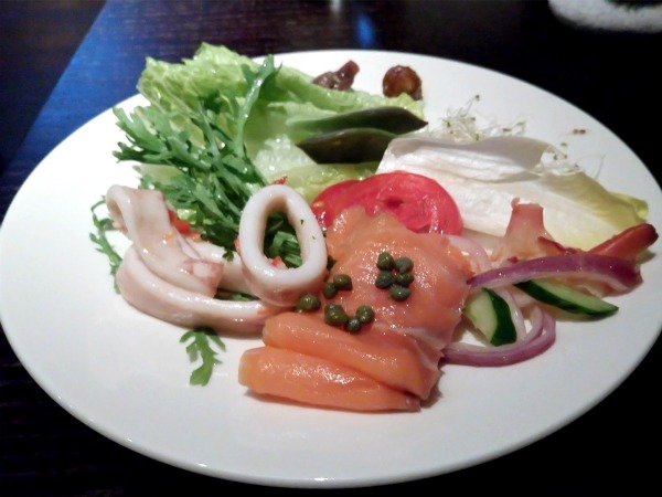 非蔬菜類的只有最後方的燻鮭魚和涼拌海鮮…這香料檸檬海鮮,莫非是從對面同樣由晶華經營的泰市場端來的? (笑)