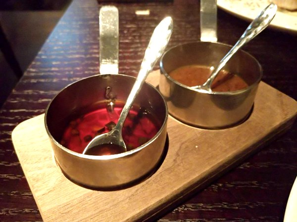 兩種醬汁: 左邊的花椒節瓜醬不會辣,花椒特殊的香氣和牛排意外的搭! 右邊的松露肉汁不只搭牛排,也很搭配菜的馬鈴薯泥。