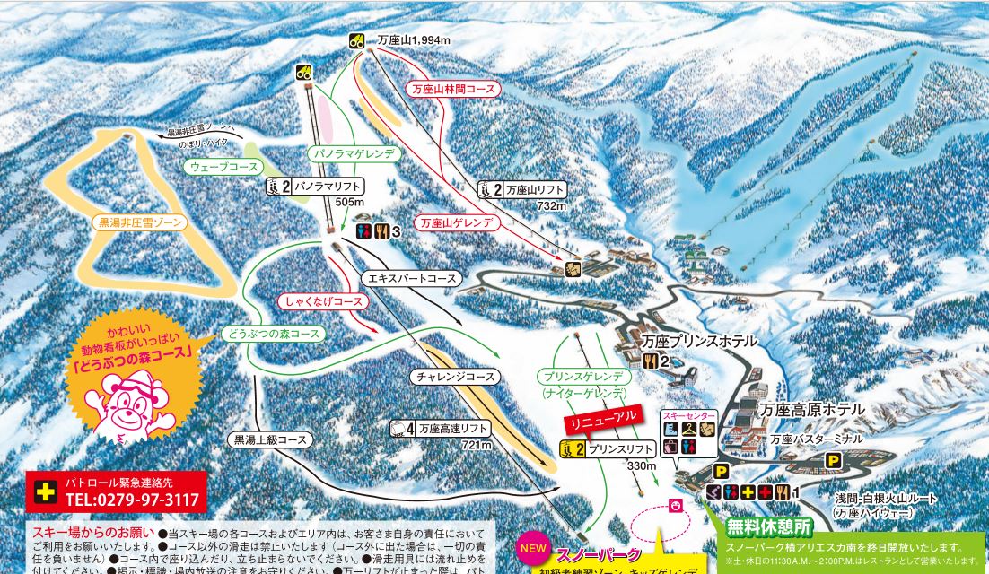 萬座溫泉滑雪場共有9條滑道,初中高級平均分布。有夜滑,另外小學生以下纜車票是免費的喔。住在萬座王子飯店,出門就是雪場,ski in out超方便。不過萬座王子飯店是在半山腰,一出門是要往下滑才能到纜車站。初學者可以請飯店載到滑道下方的ski center。