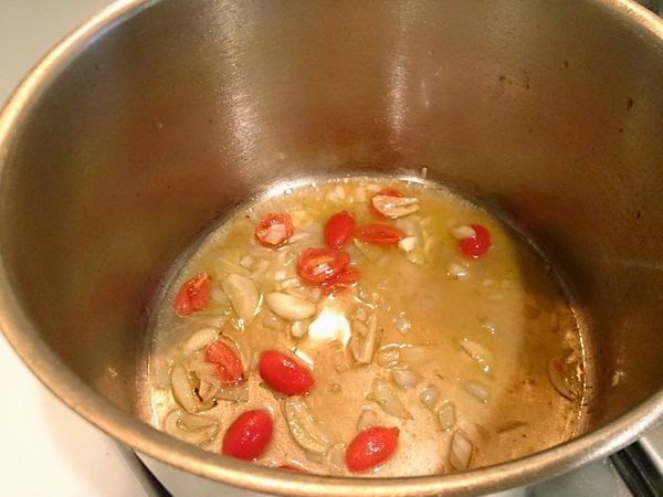 1. 取一口有鍋蓋稍有深度的大鍋,熱鍋後以橄欖油爆香蒜片。再將番茄下鍋,同蒜片爆香15秒。