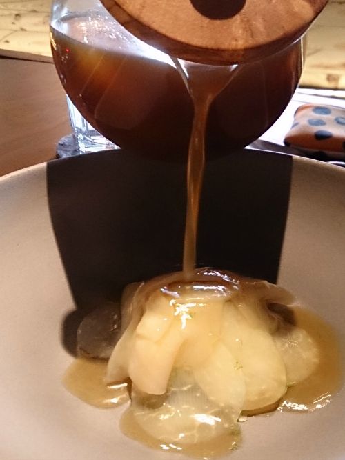 法式作法的豬耳朵沙拉,鋪上成薄片的日本小圓洋蔥,就像草間彌生的畫作一樣饒富趣味。下方是豬耳朵、四季豆、筊白筍。(我不吃四季豆,餐廳幫我換成龍鬚菜。)