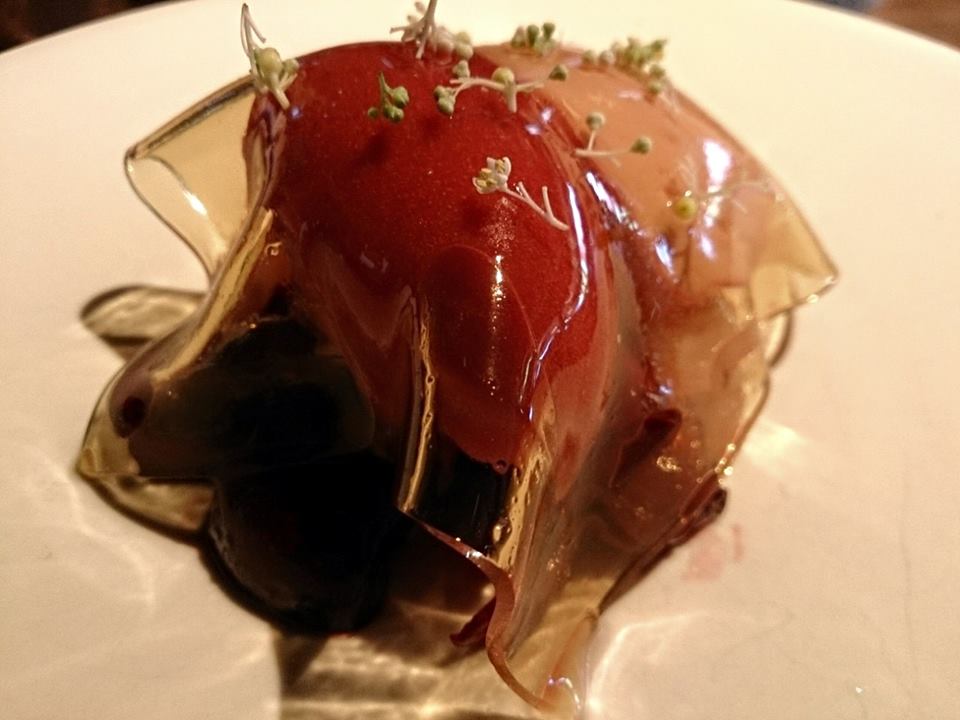 甜點是西班牙Sangria酒做的冰沙和洛神花幕斯,蓋上一層薄薄的青草茶果凍,下層有新鮮荔枝和櫻桃,還加了跳跳糖增加口感驚喜!不論擺盤或味道,這是今天最滿意的一道菜,完美呈現法國菜與台灣味擦撞出的火花。