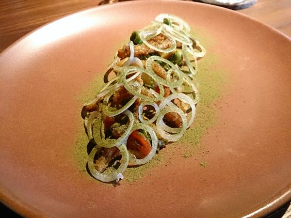 綠意盎然的豌豆和蘆筍,以及新鮮海膽,散發夏天的清爽的氣息,可惜的是下方襯的花生奶油醬太濃郁,有點不太平衡。