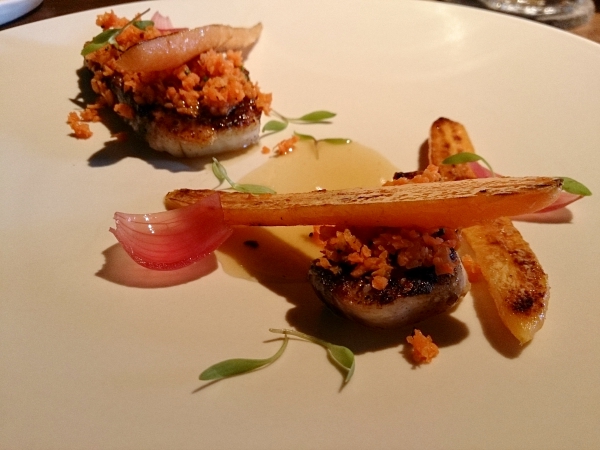煙燻風味的馬加魚,放上紅蘿蔔泥、切片的紅蘿蔔裝是,再淋上蘭嶼飛魚乾做的湯汁,彷彿在豔陽的海灘上,準備出海划獨木舟的fu。