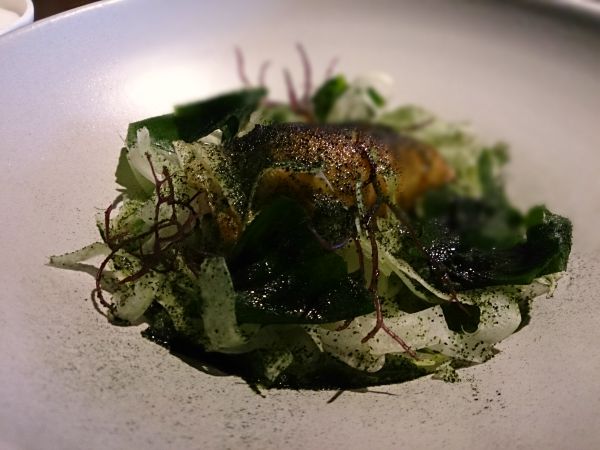 這道是我最喜歡的,彷彿是盛夏的奇幻海底世界。正中央一尾小卷烤的焦香,中間塞入佐料,旁邊有海藻和粉圓,最下方是些許的茄子泥襯底。