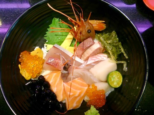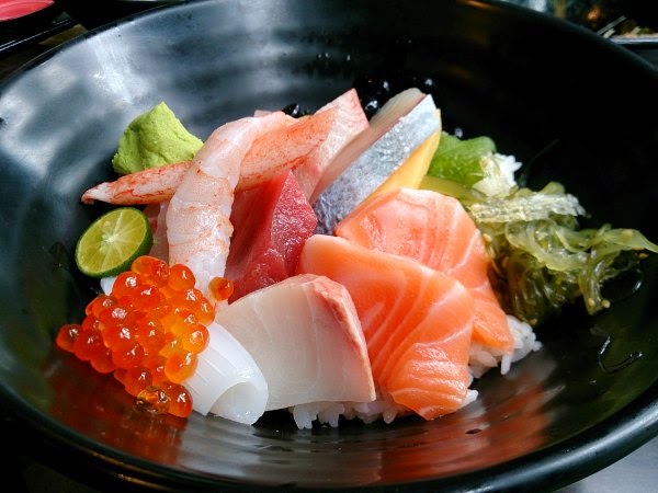 生魚片蓋飯 (NT$250) 三多屋的基本款,第一次來的朋友可從這項入手。三多屋使用的是冷醋飯,滿滿的鋪上7-8種不同的生魚片,都看不到醋飯了!