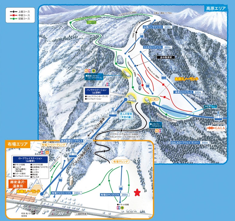 首先你要坐車到越後湯澤,雪季期間可搭免費接駁車,青線做到湯澤高原站(再走到右邊的布場ゲレンデ區域),或黃線坐到布場南口或布場中央口,往雪場右邊看就是了。