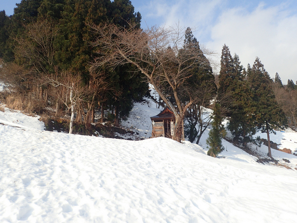 這一定是上天給我的考驗啊!!只好徒步往半山腰爬,中途為了減輕負擔,所以把雪板先插在路旁的鬆雪堆。10幾分鐘後,終於到了湯澤滑雪神社,好迷你小巧啊!沒有投擲香油錢的箱子、也沒有護身符,只有厚厚的積雪,神社安靜而寂寥。但聽說每年雪季開始前,都會用越後湯澤當地出產的清酒盛大祭拜,祈求滑雪平安。(今年還要多拜一項「不要鬧雪荒」吧。) 趕緊參拜一下,祈求雪友們各個雪運昌隆!
