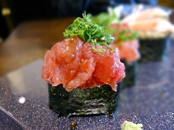 朋友推薦的鰹魚握壽司 (NT$70),師傅在魚肉上放了點蒜泥和蔥,更凸顯出鰹魚濃厚的味道。