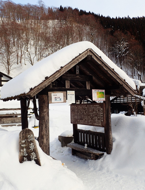 鶴之湯非常隱密,從大馬路彎進山間小路,開了20多分鐘才道。目前是旅館,也提供只泡溫泉(日歸湯)的服務,而當時的建築物一直保留到現今,大雪中的鶴之湯,木造建築與茅草鋪成的屋頂,古樸又帶著幾分神秘感。。在冬季時,屋頂特別套上塑膠套保護著(不然一下雪屋內就漏水了吧…)。